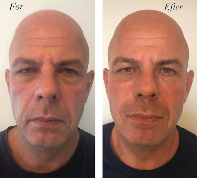 Der behandles med ikke permanent filler 2 ml, – fordelt med 0,5 ml i hver kindben og 0,5 ml i begge furer fra næse ned til mund.